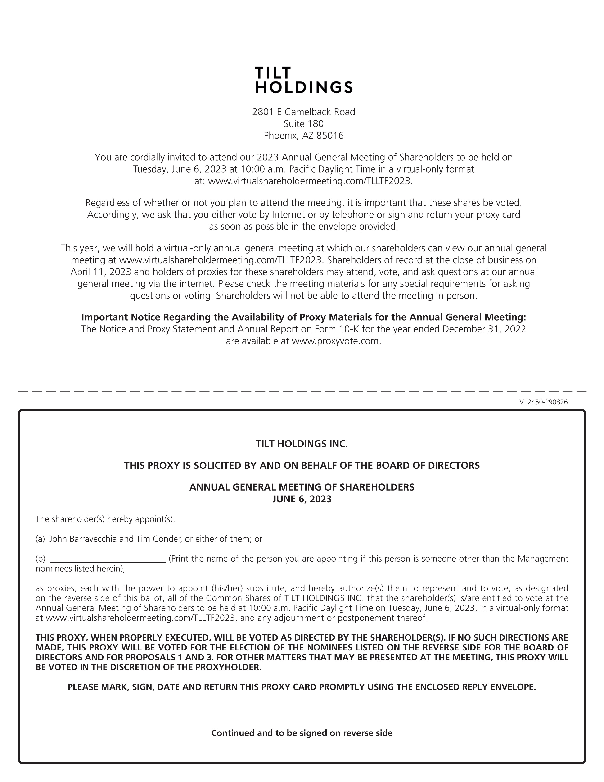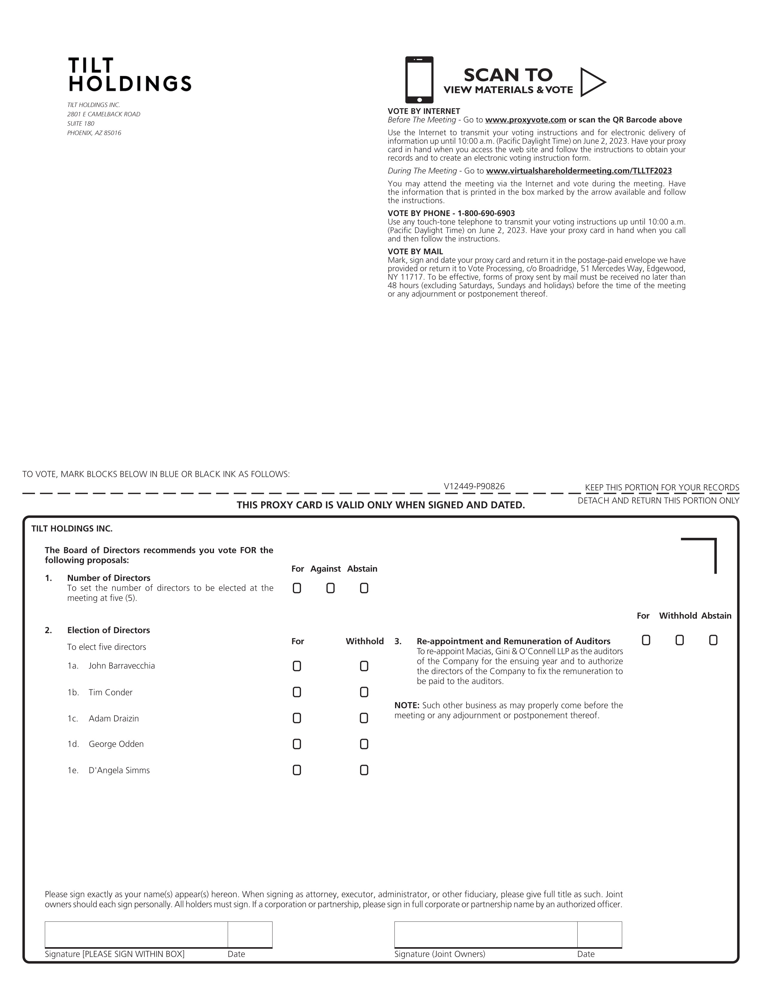 The Notice of Meeting, Proxy Statement, and Annual Report on Form 10-K for the fiscal year ended December 31, 2022 are available online at www.proxyvote.com. and on the “Investors” section of our website at www.tiltholdings.com/investors. A copy of our Annual Report on Form 10-K for the fiscal year ended December 31, 2022, as filed with the SEC on March 16, 2023, except for exhibits, will be furnished without charge to any shareholder upon written request to our Investor Relations at investors@tiltholdings.com.