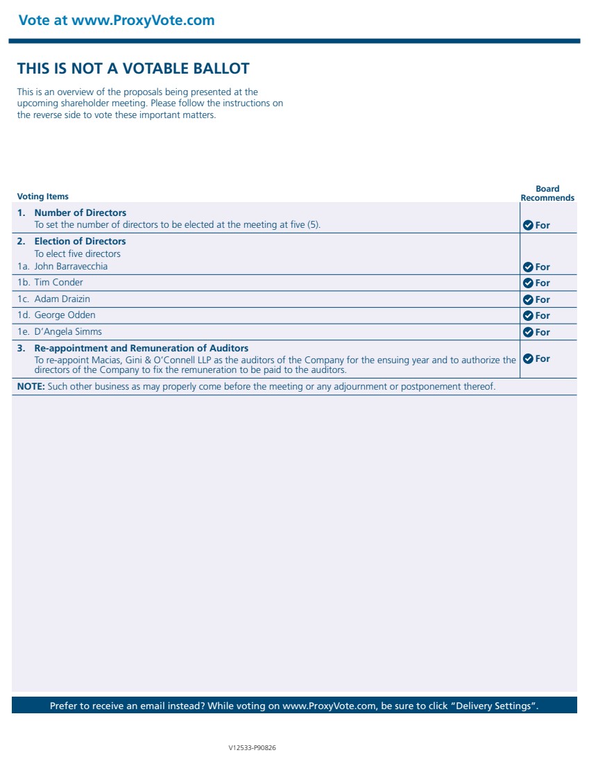 | THIS IS NOT A VOTABLE BALLOT This is an overview of the proposals being presented at the upcoming shareholder meeting. Please follow the instructions on the reverse side to vote these important matters. Vote at www.ProxyVote.com Prefer to receive an email instead? While voting on www.ProxyVote.com, be sure to click “Delivery Settings”. Voting Items Board Recommends V12533-P90826 2. Election of Directors To elect five directors 1c. Adam Draizin 1a. John Barravecchia 1d. George Odden 1b. Tim Conder 1e. D’Angela Simms 3. Re-appointment and Remuneration of Auditors To re-appoint Macias, Gini & O’Connell LLP as the auditors of the Company for the ensuing year and to authorize the directors of the Company to fix the remuneration to be paid to the auditors. NOTE: Such other business as may properly come before the meeting or any adjournment or postponement thereof. For For For For For For For 1. Number of Directors To set the number of directors to be elected at the meeting at five (5). |